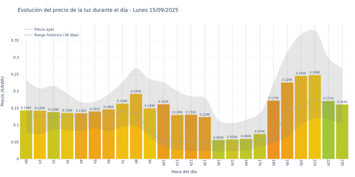 Este Lunes 15 de septiembre, la hora más barata es de 14:00 a 15:00, con un precio de 0.0561 €/kWh.