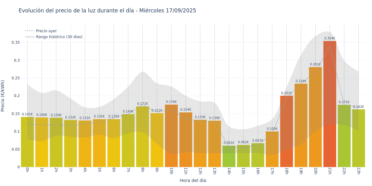 Este Miércoles 17 de septiembre, la hora más barata es de 14:00 a 15:00, con un precio de 0.0606 €/kWh.