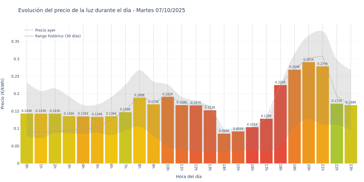 - Precio más bajo: 0.0859 €/kWh a las 14:00