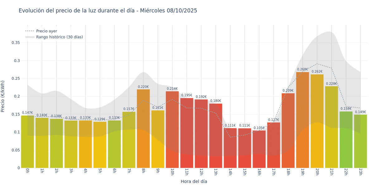 Este Miércoles 8 de octubre, la hora más barata es de 16:00 a 17:00, con un precio de 0.1048 €/kWh.