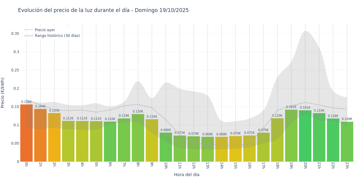 Este Domingo 19 de octubre, la hora más barata es de 14:00 a 15:00, con un precio de 0.0681 €/kWh.