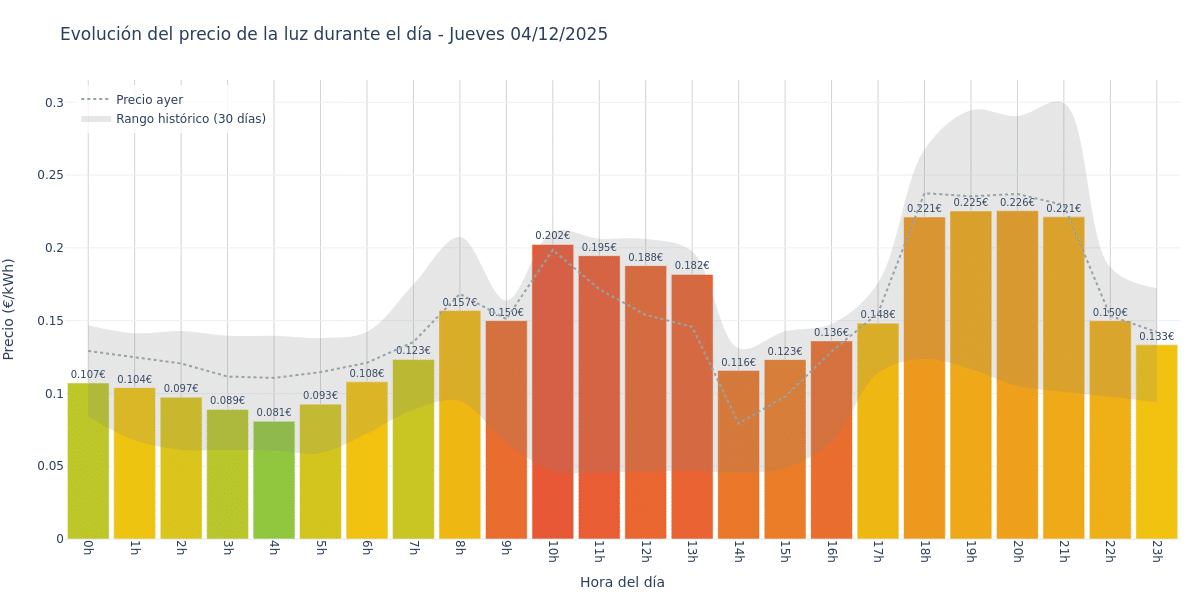Este Jueves 4 de diciembre, la hora más barata es de 4:00 a 5:00, con un precio de 0.0808 €/kWh.