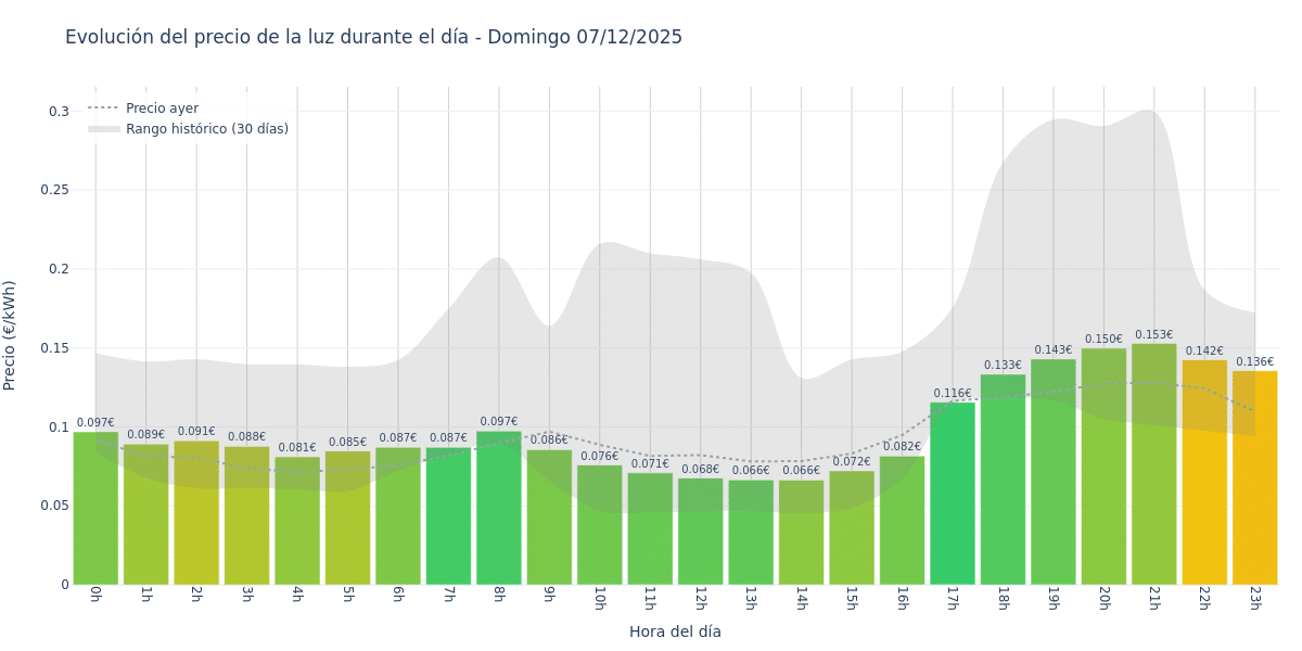 Este Domingo 7 de diciembre, la hora más barata es de 14:00 a 15:00, con un precio de 0.0663 €/kWh.