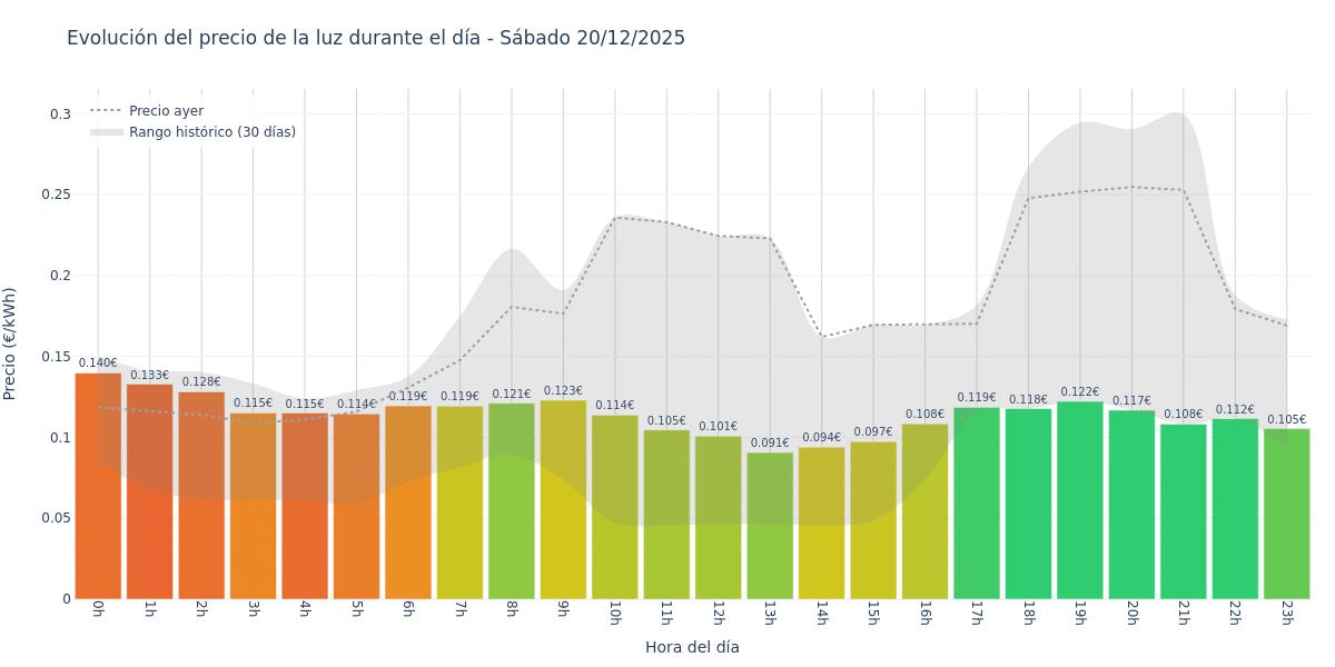 Este Sábado 20 de diciembre, la hora más barata es de 13:00 a 14:00, con un precio de 0.0907 €/kWh.