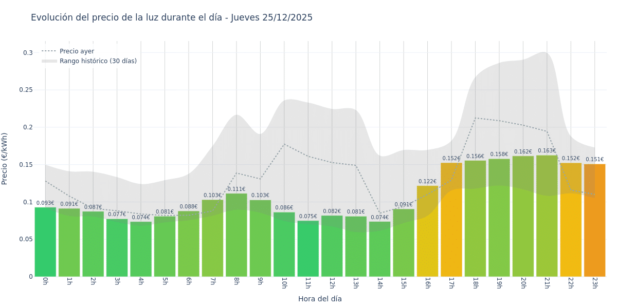 El precio medio de la luz este Jueves 25 de diciembre es de 0.1089 €/kWh, lo que supone un descenso del 16.4% respecto a ayer.