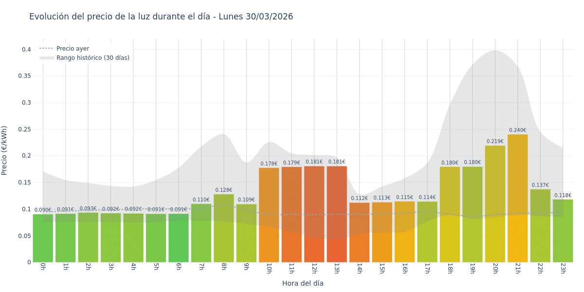 Este Lunes 30 de marzo, la hora más barata es de 0:00 a 1:00, con un precio de 0.0905 €/kWh.