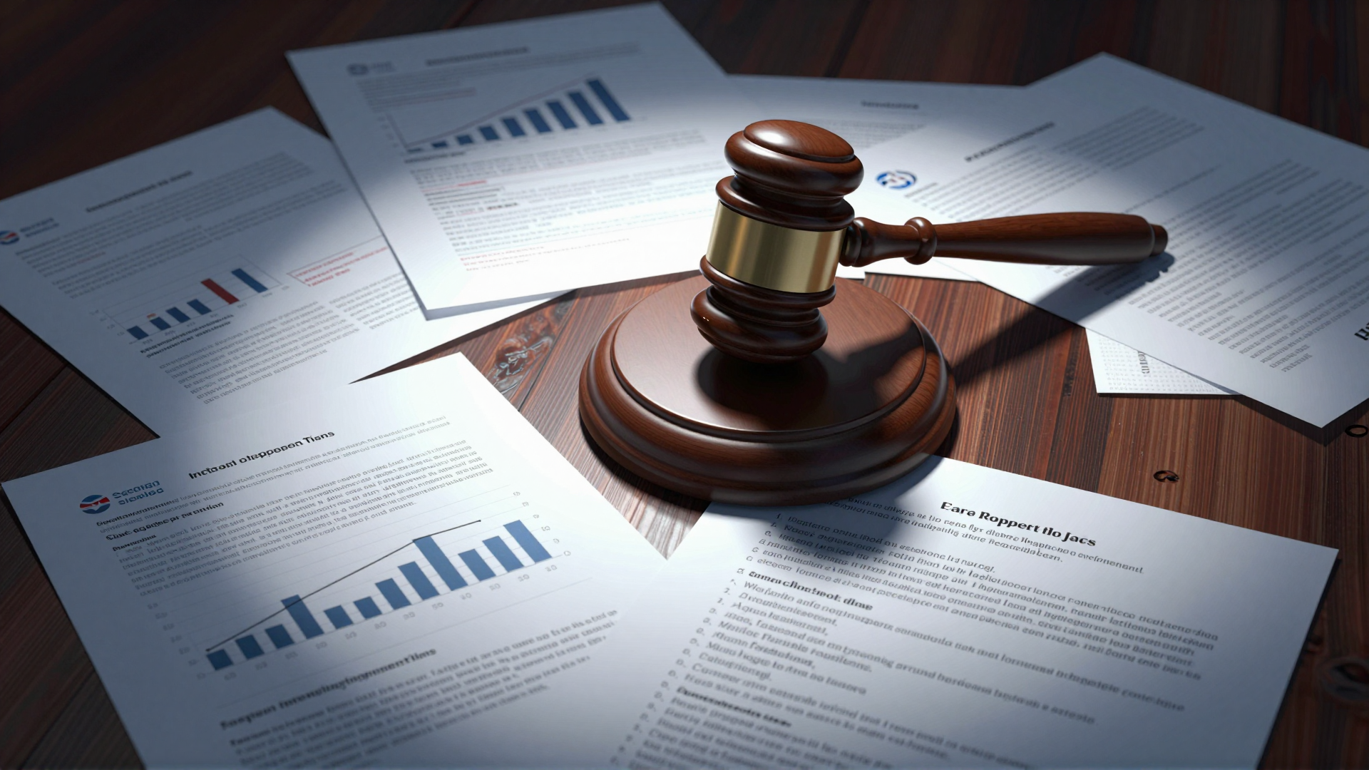 A judge's gavel on a mahogany table surrounded by documents about social media addiction.