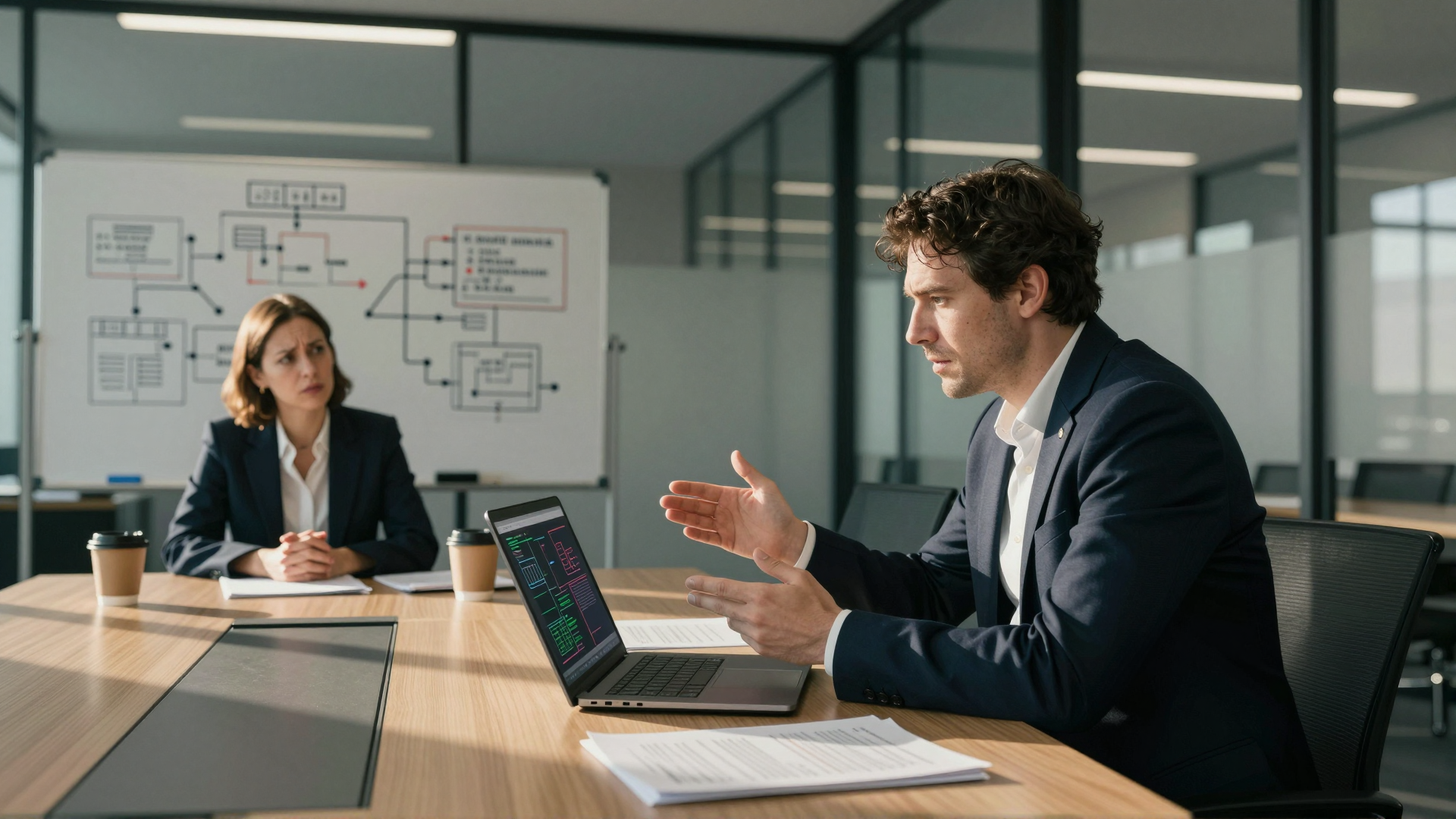 Engineer explaining complex diagrams to a confused executive in a corporate conference room.