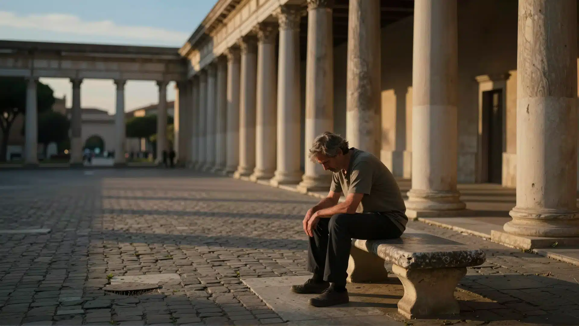 A solitary person in a Roman courtyard reflects on worries at golden hour, embodying Stoic contemplation.