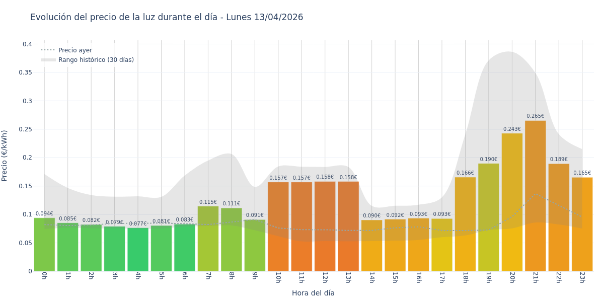 Este Lunes 13 de abril, la hora más barata es de 4:00 a 5:00, con un precio de 0.0765 €/kWh.