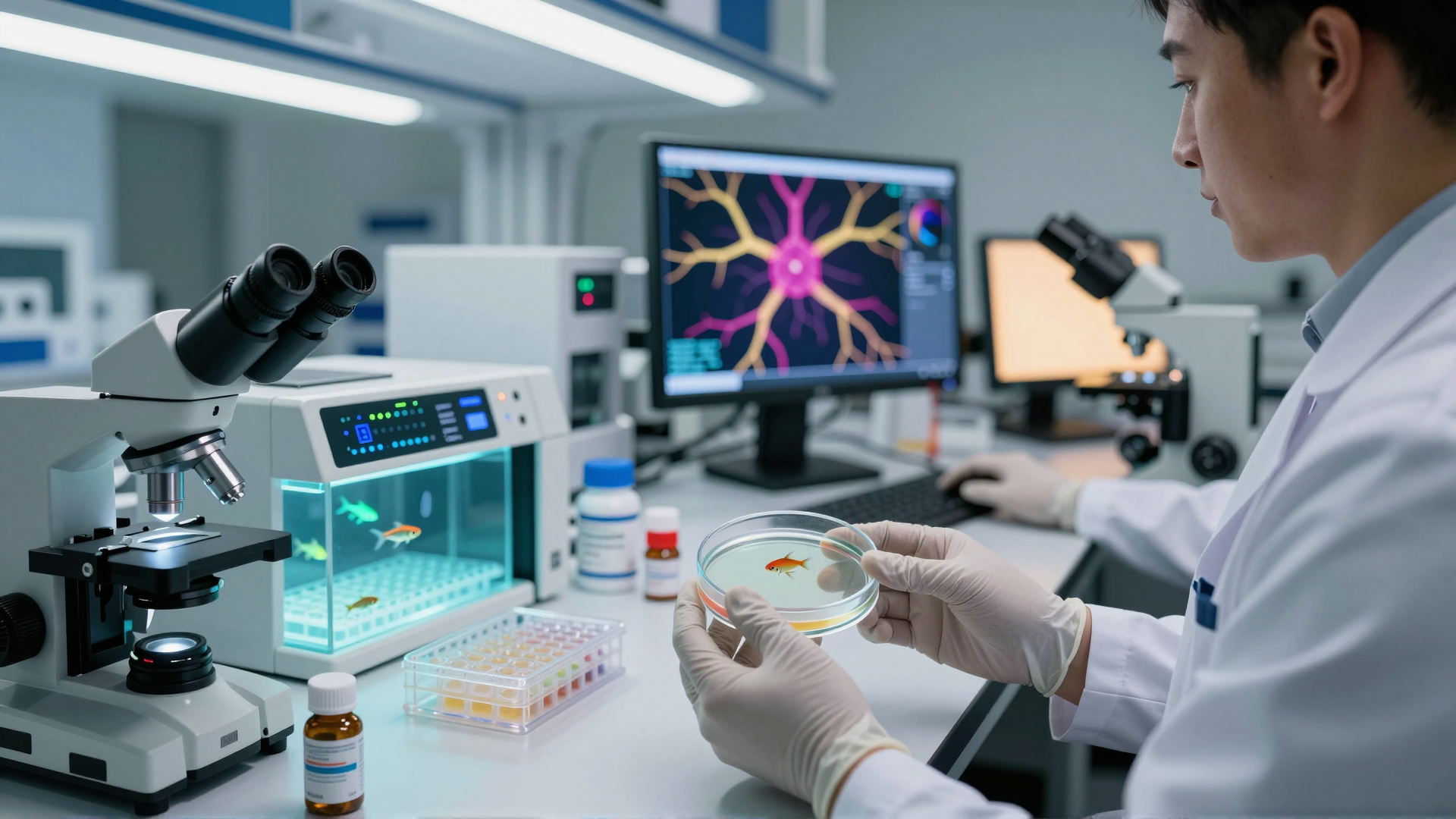 El pez cebra comparte aproximadamente el 70 % de sus genes con los humanos. En fase larvaria es transparente, se reproduce en grandes cantidades y admite manipulación genética con relativa facilidad, lo que lo convierte en un sistema idóneo para cribar fármacos a escala —algo prácticamente inviable con modelos de mamíferos.