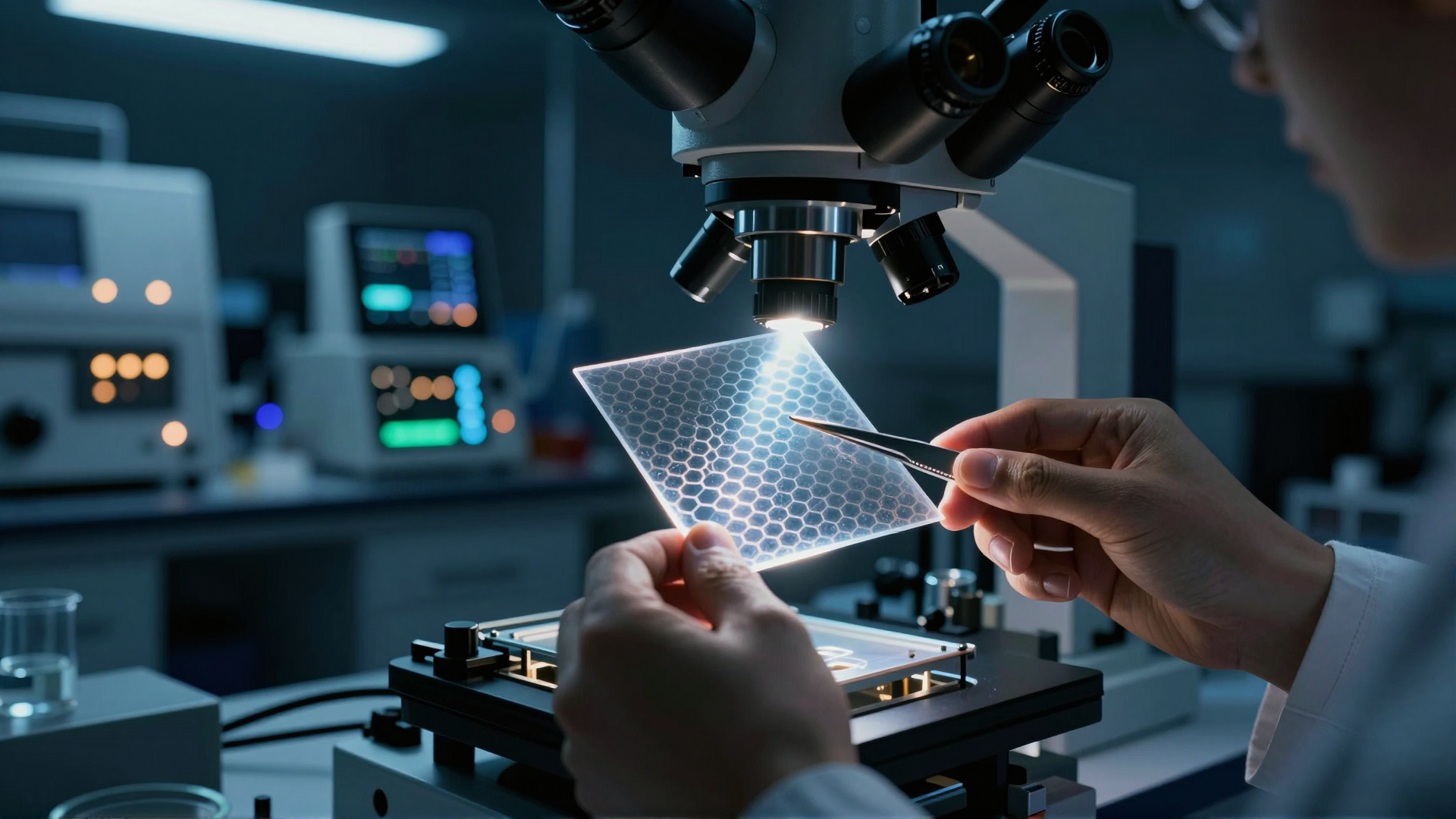 Inside a nanoscience lab, a researcher skillfully handles a graphene sample, revealing its unique properties and challenges to physics.